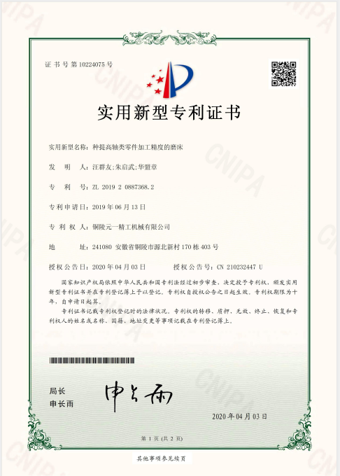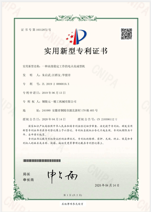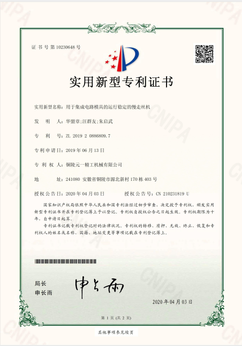 Recently, the company has six utility model patents authorized by the State Intellectual Property Office. Patent name: "A new type of surface grinder" Patent number: ZL 2019 2 1734534.1 Patent name: "A grinder to improve the machining accuracy of shaft parts" Patent number: ZL 2019 2 0887368.2 Patent name: "a lathe with fast automatic clamping and feeding" Patent number: ZL 2019 2 0887369.7 Patent name: "Wire EDM for easy recovery of spark oil for integrated circuit molds" Patent number: ZL 2019 2 0887366.3 Patent name: "Slow wire machine for stable operation of integrated circuit molds" Patent number: ZL 2019 2 0886809.7 Patent name: "A high-efficiency and stable working EDM machine" Patent number: ZL 2019 2 0886810.X |